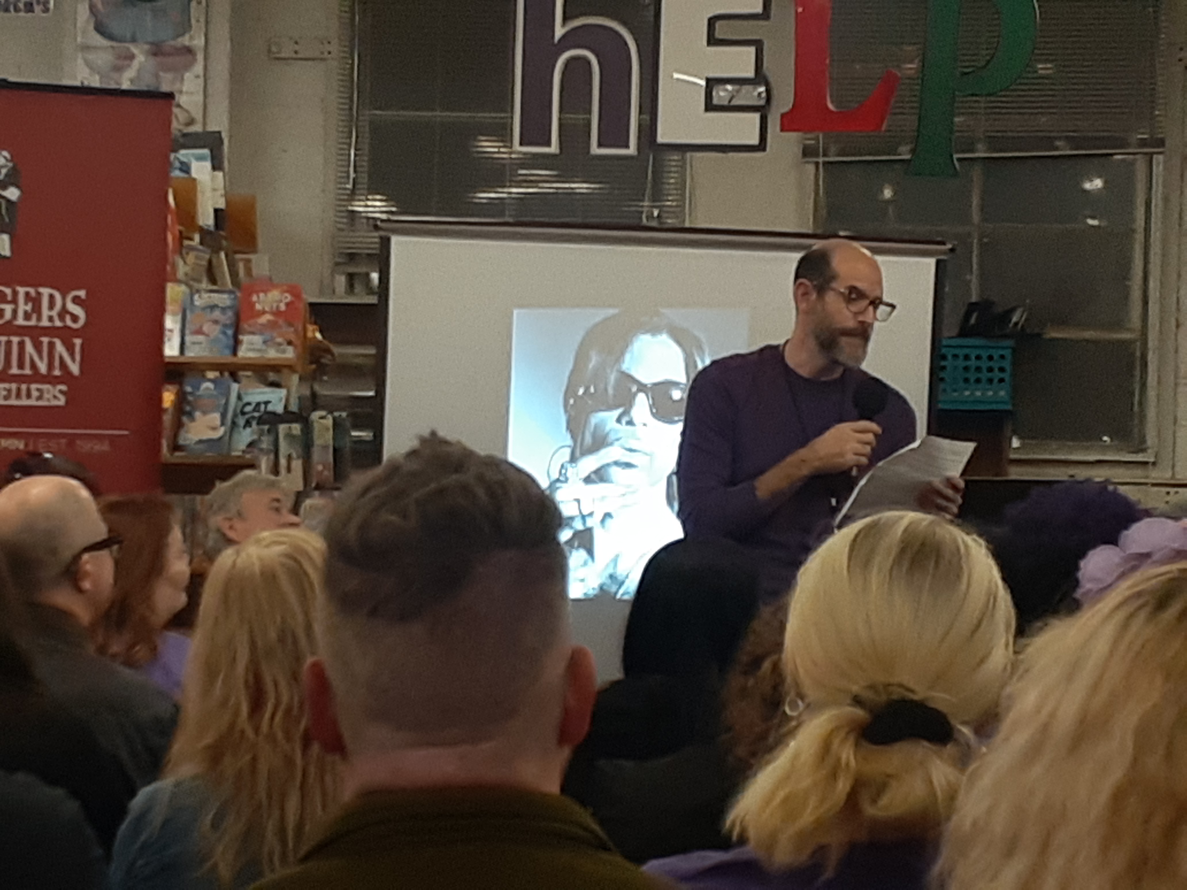 The event space, which Magers & Quinn improvises within its most conspicuous browsing area of roughly 20’ x 20’ space is squeezed among bookshelves. This accommodated several rows of between six and eight metal folding chairs each.